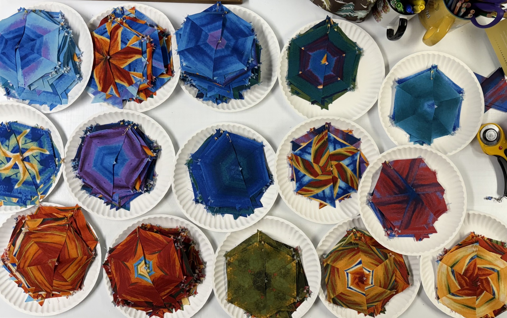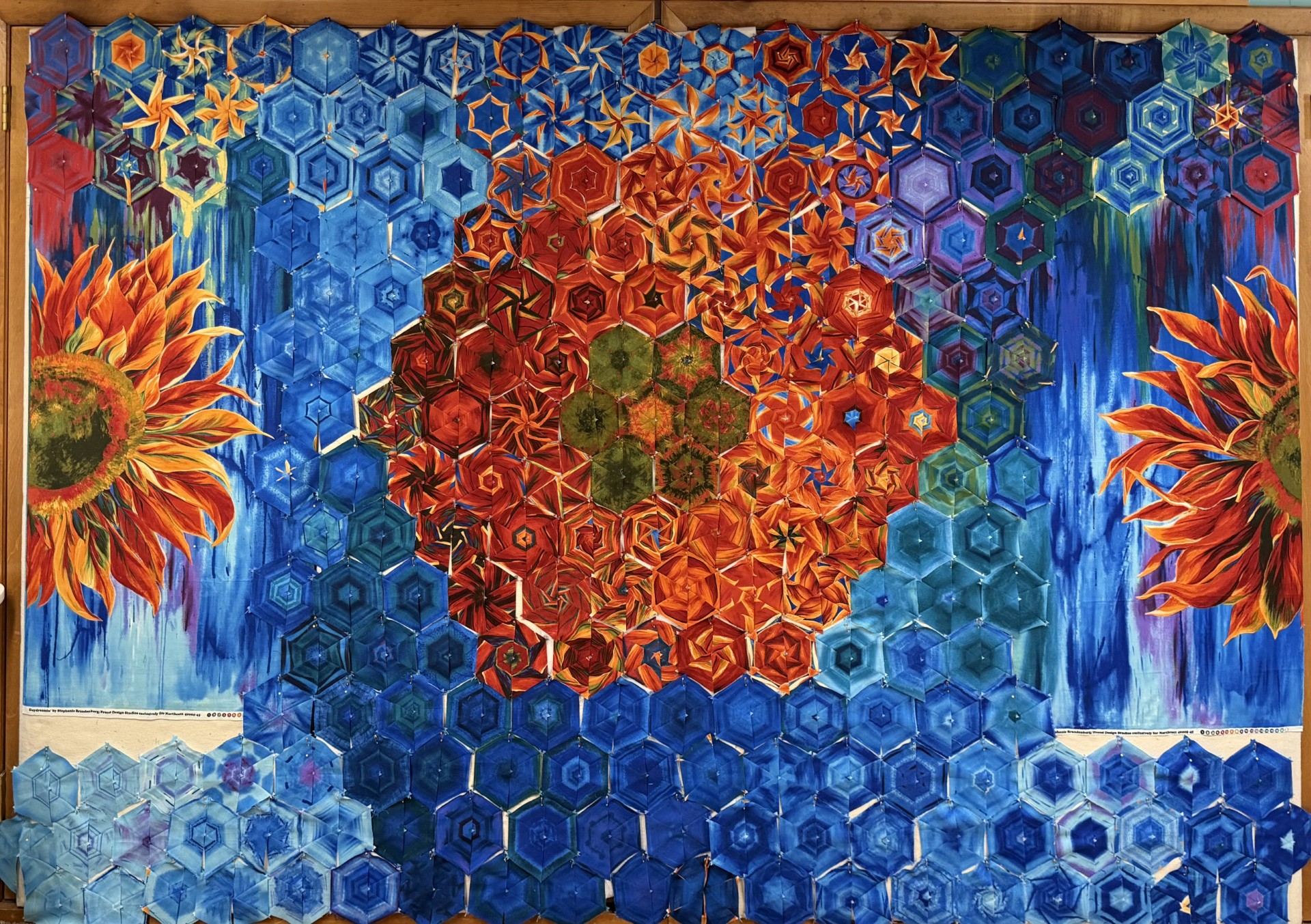 Dianne worked so hard to design and adjust this Van Go like panel, fabulous job! Carol was exploring and learning to make Hollow Cube 60 units. Her fabric created beautiful whimsical hexies!