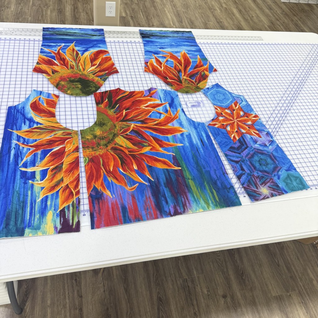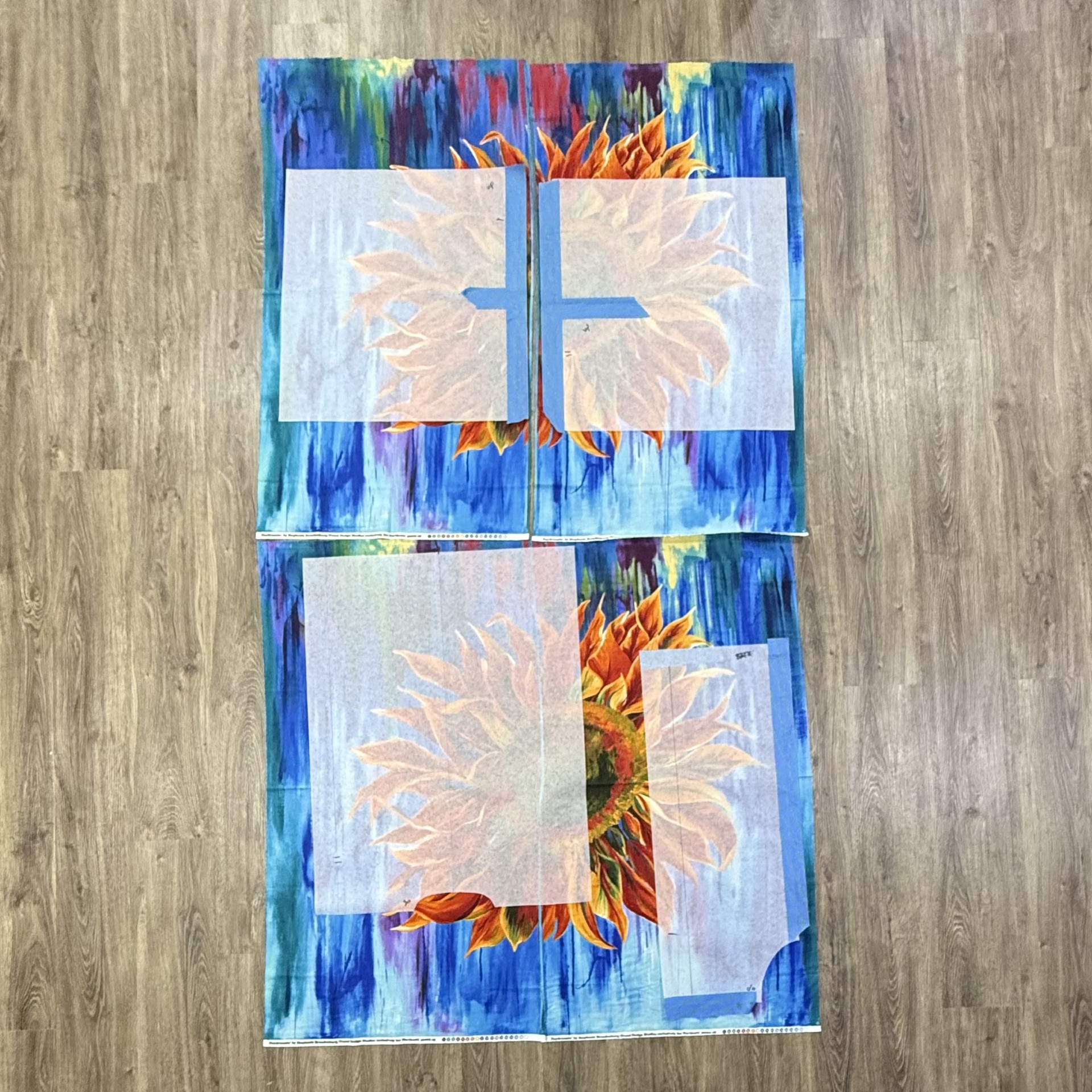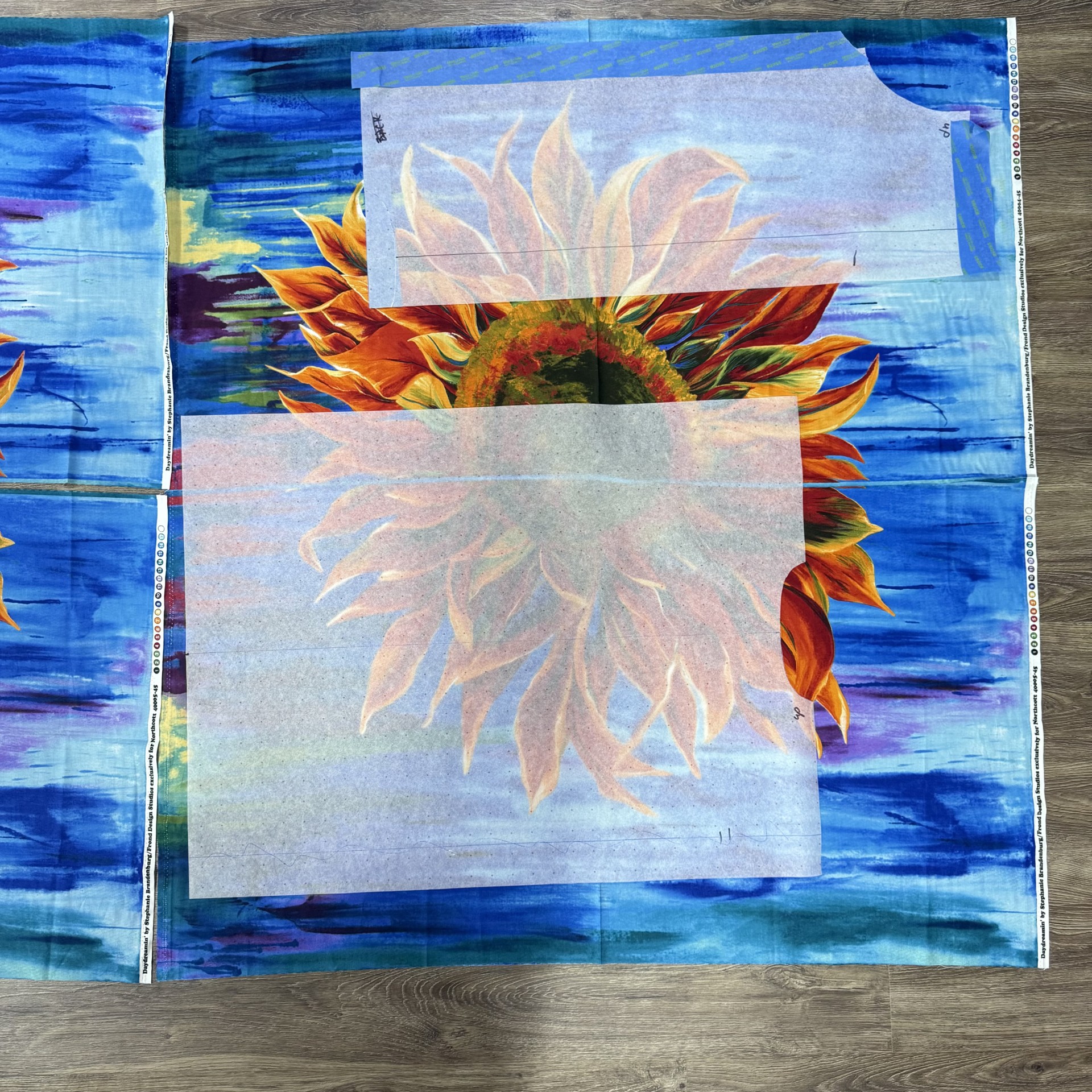 These two panels were created by Frond Design for Northcott Fabrics. Terri had it on her design wall and I have had them in my OBW stash for a couple of years. The normal thing would be to stitch the halves together and design around them. Why be normal? We decided to do what we do best. A One Block Wonder coat and quilt out of the same panels!