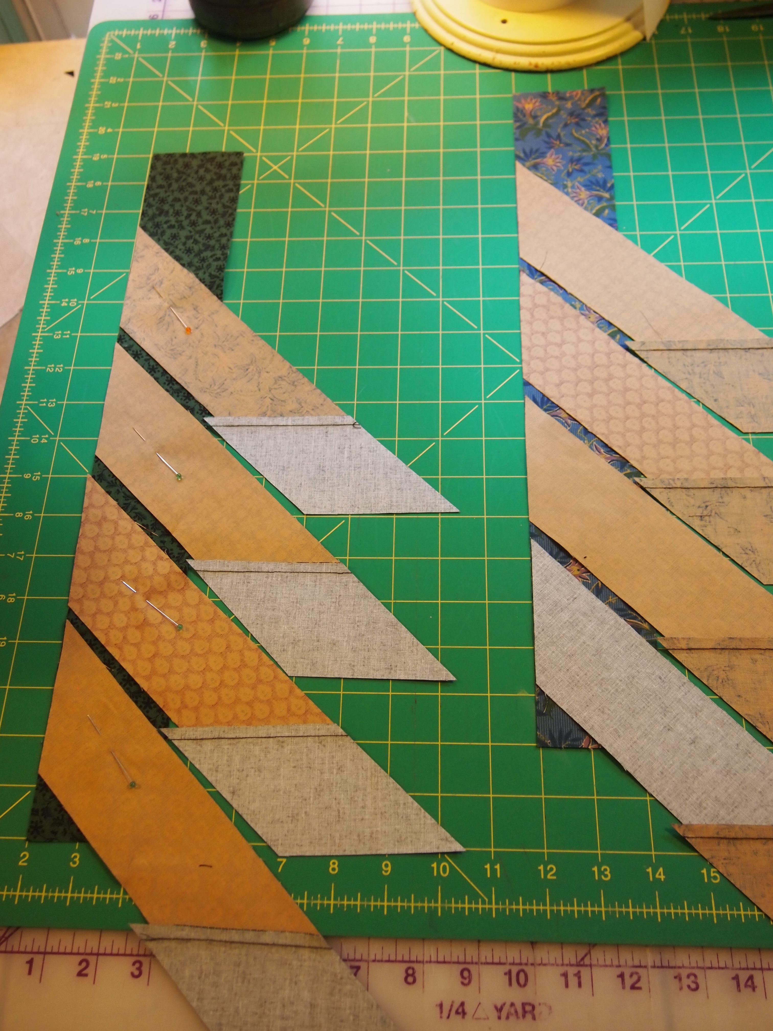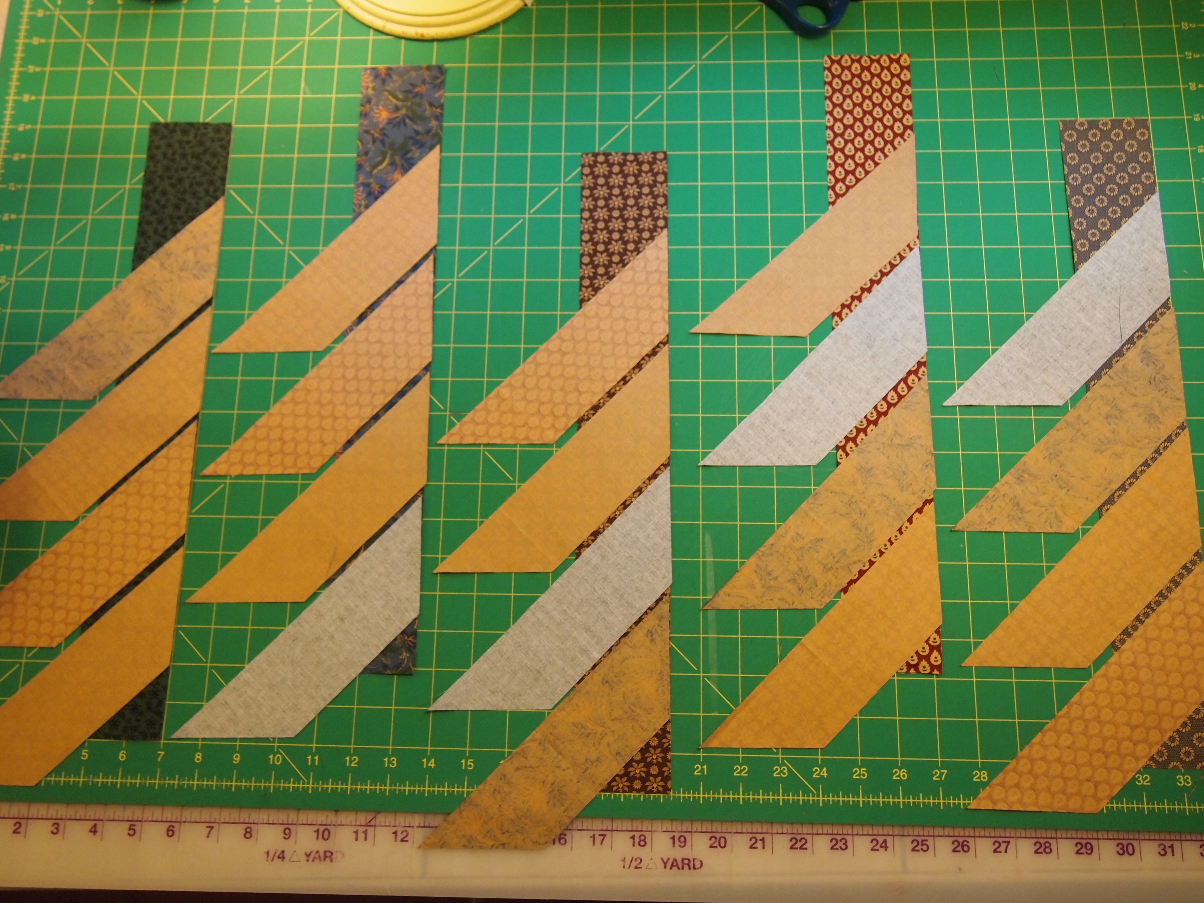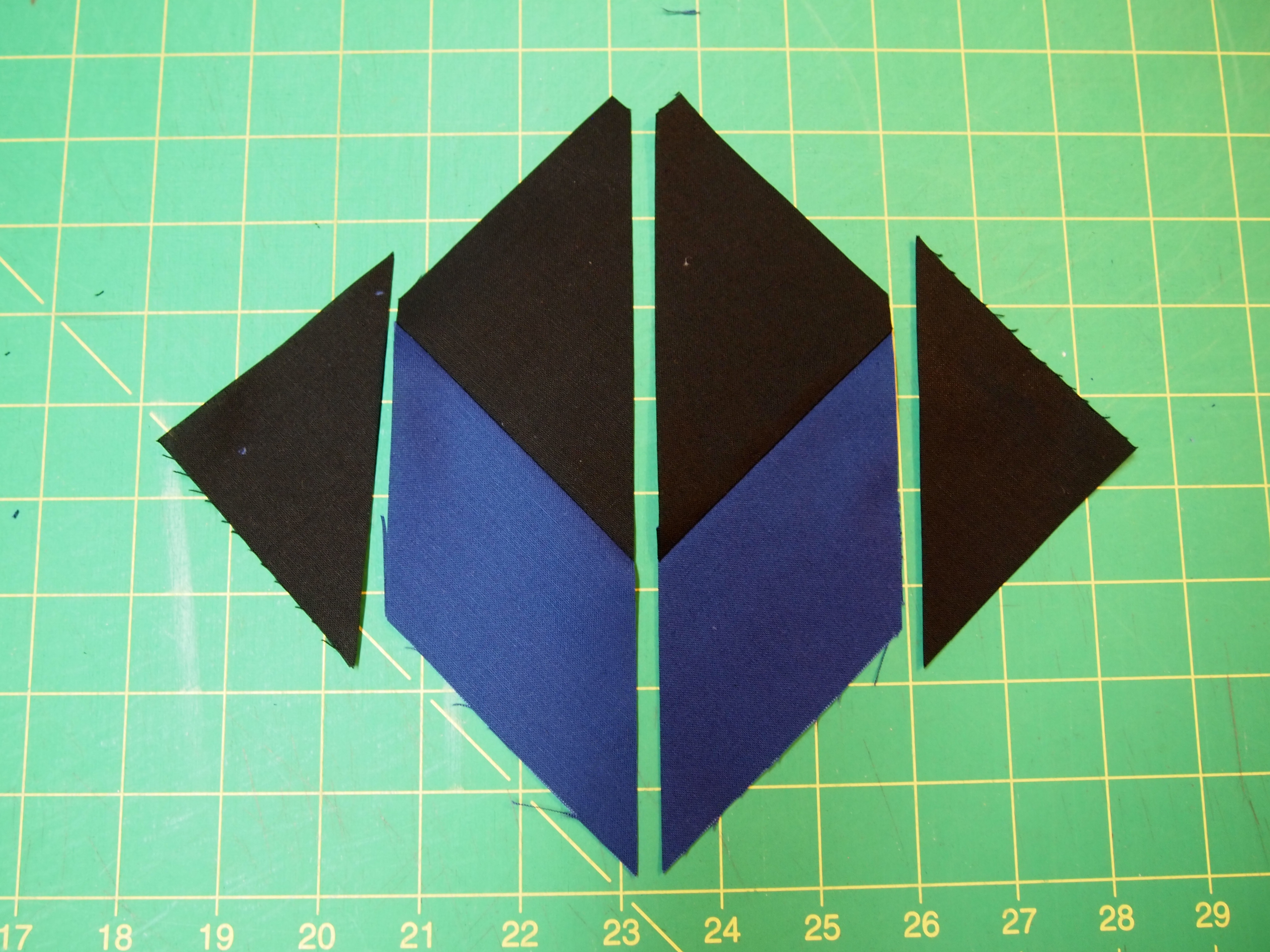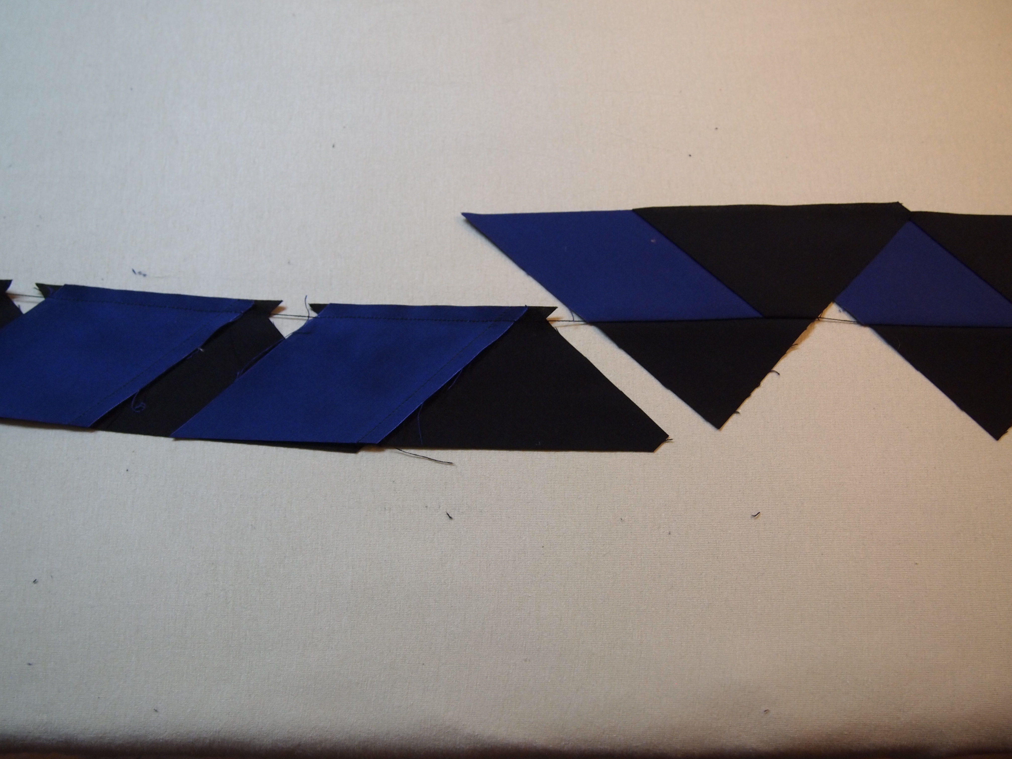 We are now ready to sew this unit together. Layout the 2 flying geese, 1 left slanted Quicket, 1 right slanted Picket and 1 half square triangle as shown above..