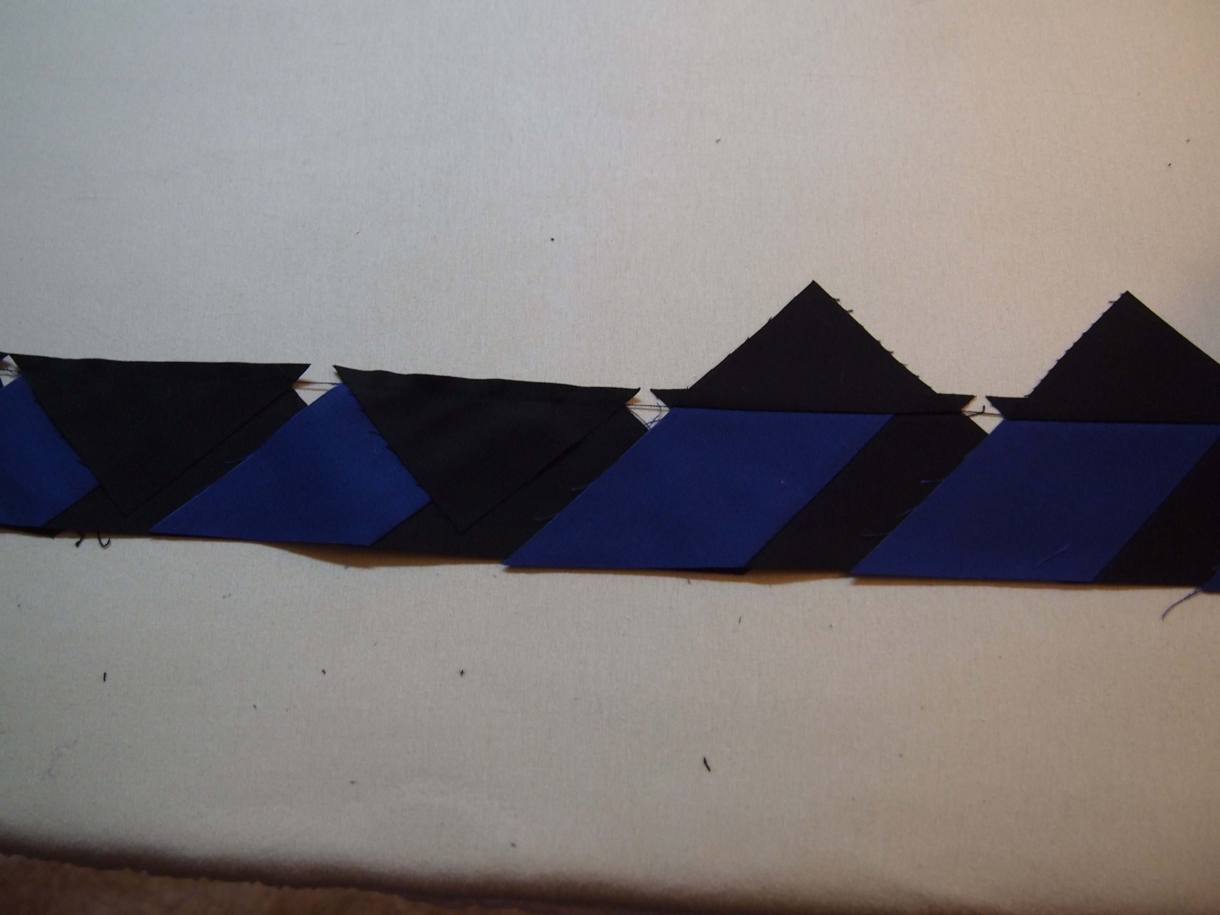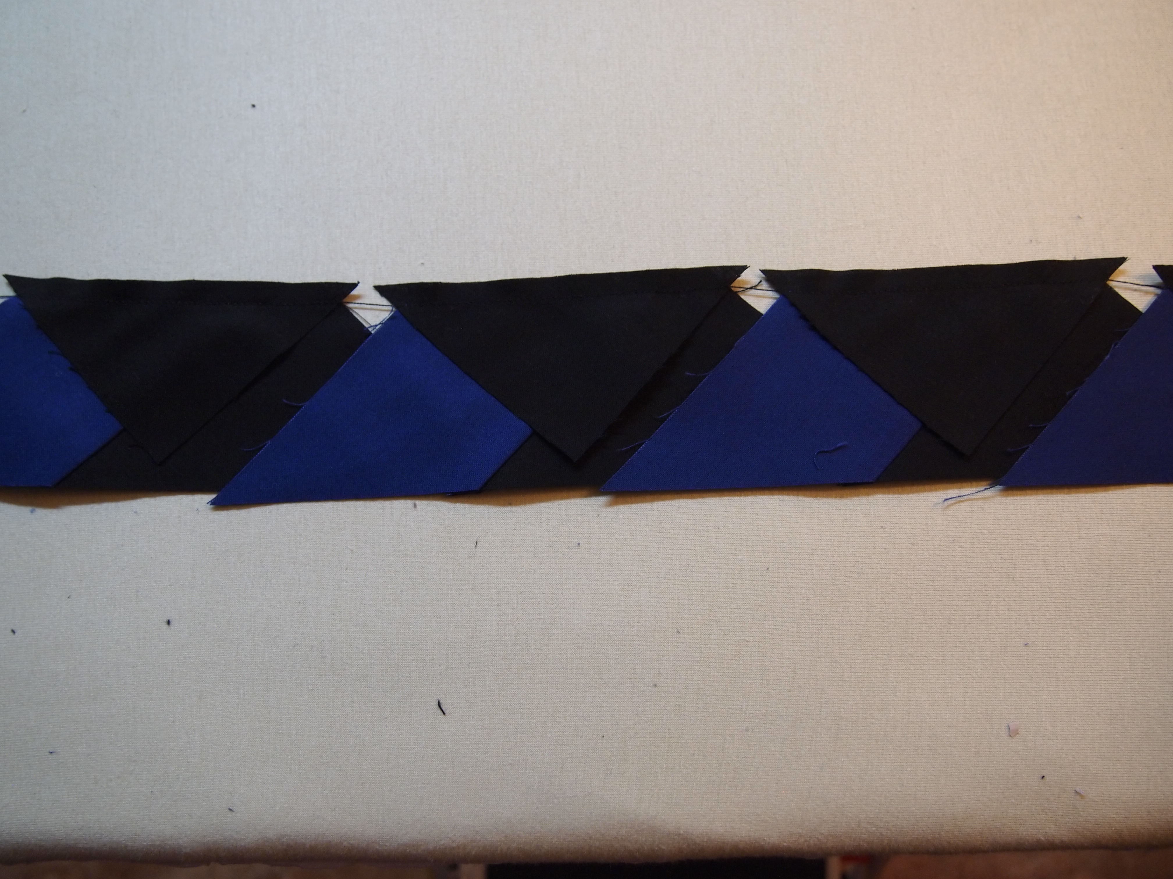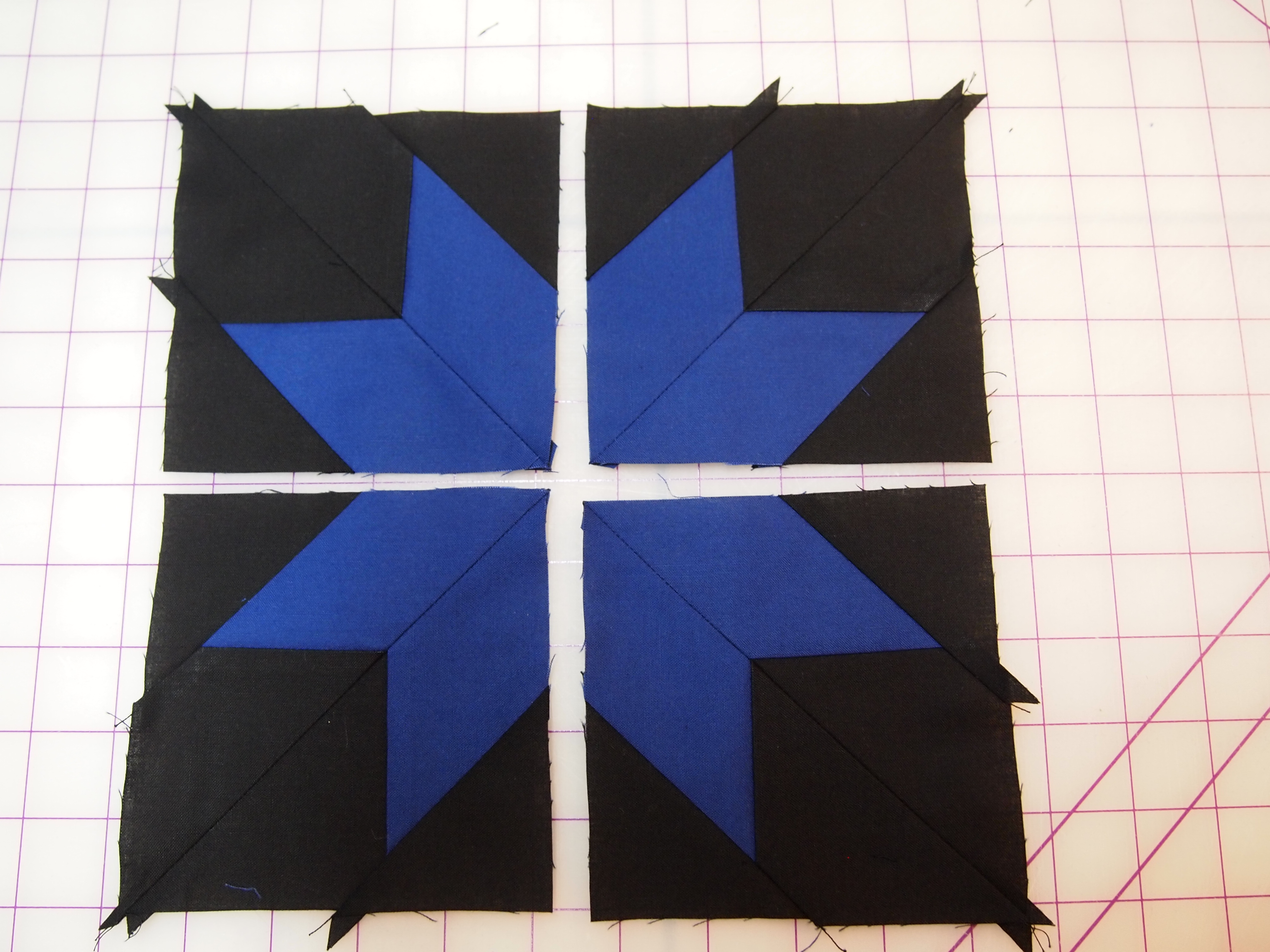 Repeat the process for each of the other 3 sections. If all of your geese are the same color you can make all your flying geese in sets of four, then make the Pickets & Quickets using the method in the technique sheet. When I stitched the four sections togehter I pressed the seams open to avoid bulk.