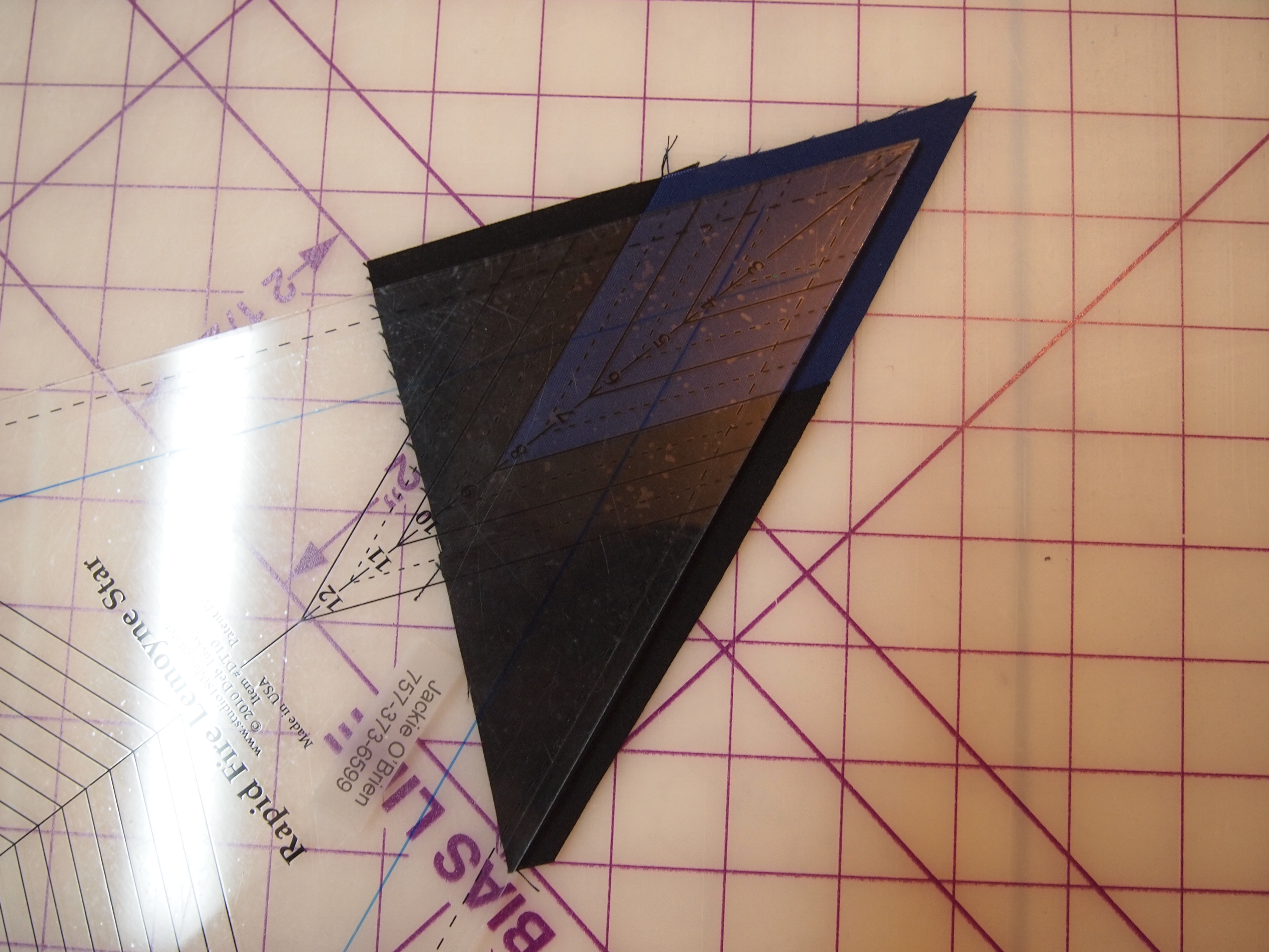Lift your Wing Clipper tool and rotate your unit 180 degrees. Align the trim down lines with the just trimmed raw edges and aligning the long diagonal line on the tool with the single diagonal seam. Trim up the right side and across the top.