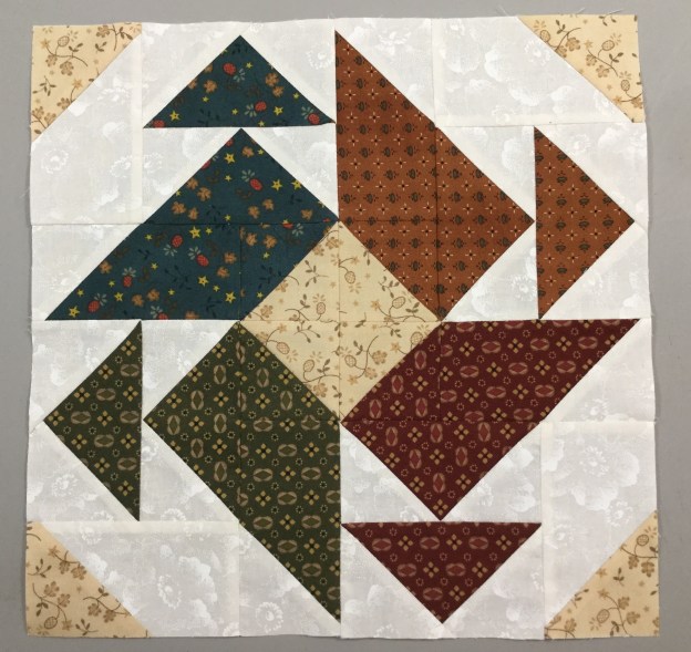 This is a tricky block; you will need to pay attention to your fabric placement and the orientation of your quicket and picket units. To help you out here is link to the Whirligig Black Line Layout you can print this sheet and use your colored pencils to help choose your fabrics and placement.