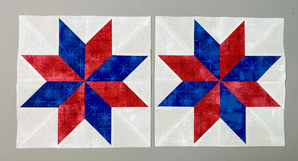 Two WOF background strips & two WOF star strips will yield 2 – 12” finished lemoyne star blocks.